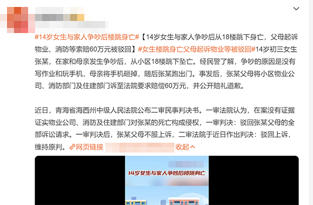 一个14岁的女孩,因为写作业和玩手机的事跟妈妈吵起来,妈妈砸了手机,孩子转头就从18楼跳了下去,最终身亡。